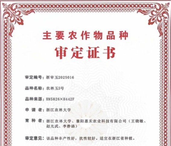 近日,浙江省农业农村厅发布公告(2025第7号),由我院种子科学与技术团队自主选育的玉米新品种‘农林玉5号’通过浙江省农作物品种审定,审定编号为浙审玉2025016。‘农林玉5号’生育期113.3天,株高269.0厘米,穗位高107.6厘米,果穗长筒型,籽粒黄色,半马齿型,轴白色,穗长19.6厘米,穗粗4.8厘米,轴粗2.9厘米,穗行数16.2行,行粒数40.7粒,单穗重256.9克,千粒重299.6克,出籽率77.5%,籽粒容重722.5克/升,蛋白质含量8.6...